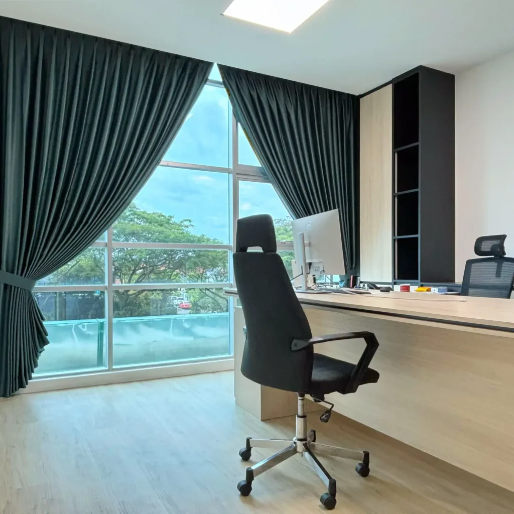 Office curtains and blinds offer adjustable light control, reducing glare on screens and creating a comfortable, well-lit workspace for productivity.